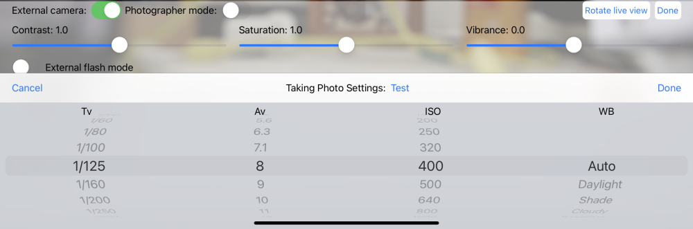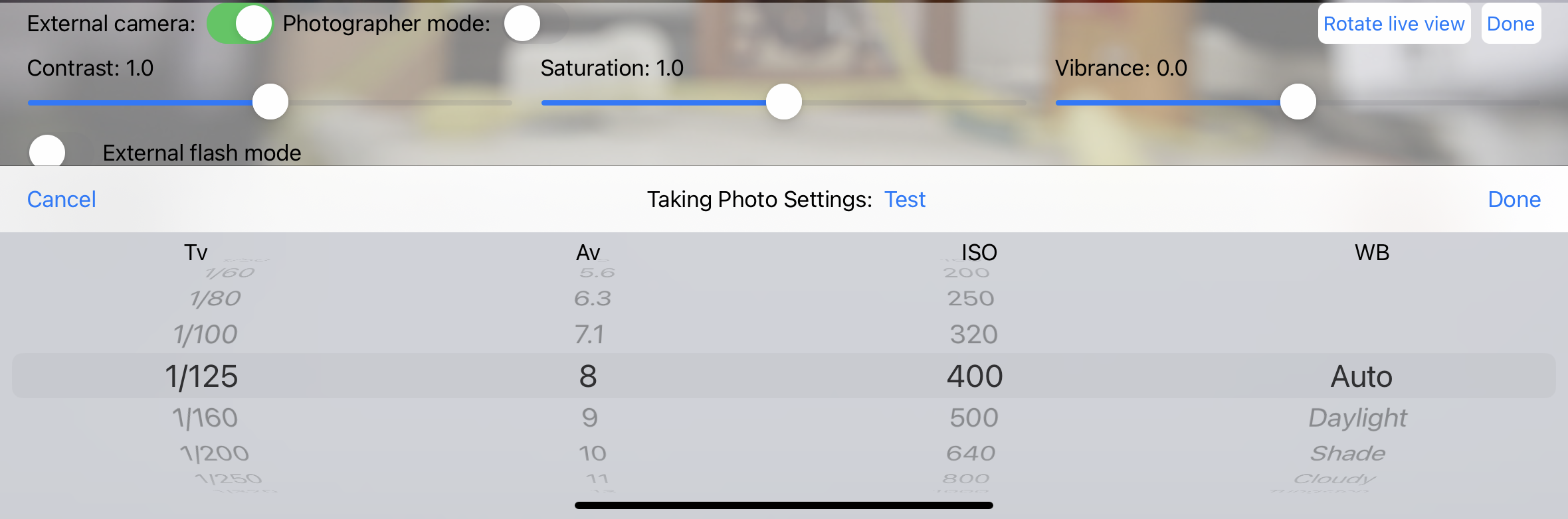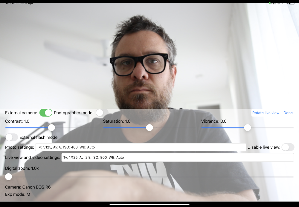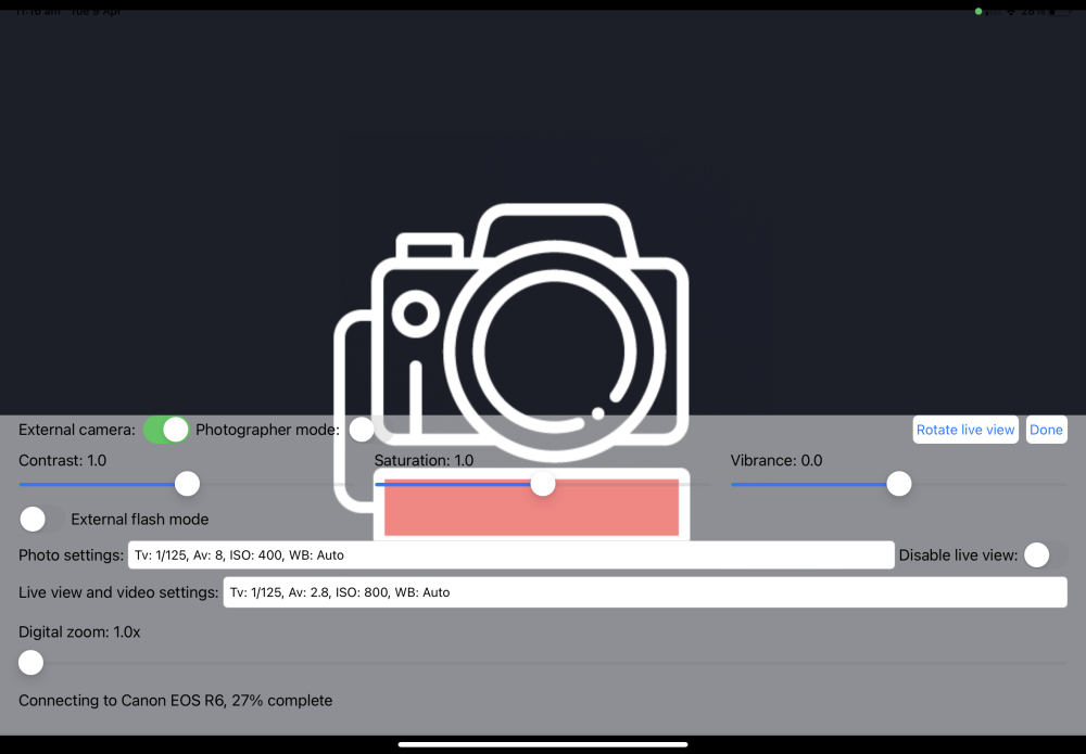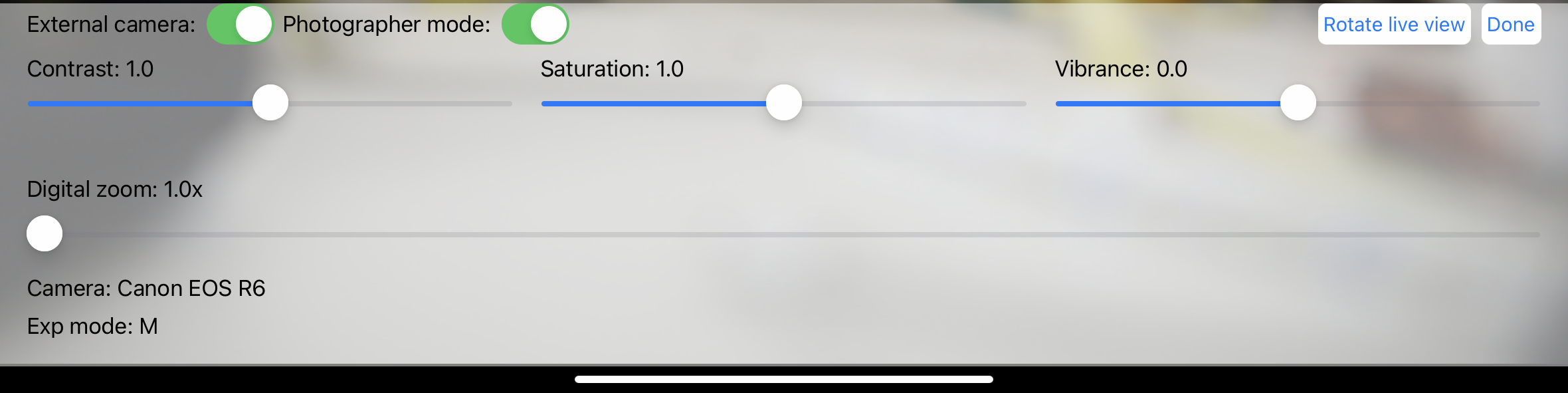 Tap the Rotate live view button to rotate the live view images from the external camera if they are not the right way up. The live view is rotated 90 degrees each time the Rotate live view button is pressed. The camera orientation does not need to be the same as the iPad e.g. the camera can be in landscape orientation with the iPad in portrait orientation or any other combination.