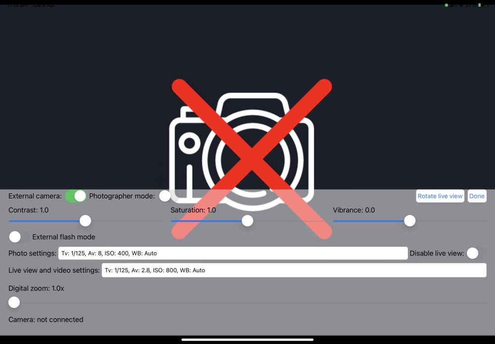 The camera settings screen will display a graphic showing a camera with a red X if it is not connected to a camera. Connect the camera to the device and turn the camera on.