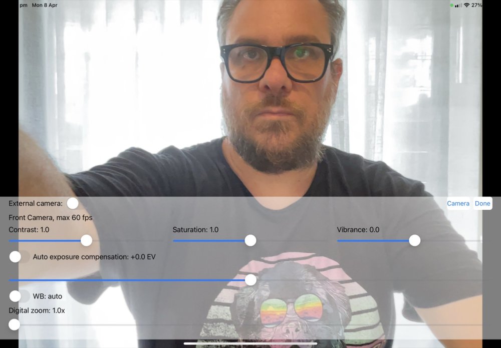 By default, the internal camera of your device is enabled and it is set to an automatic exposure and white balance mode. You can cycle between the available cameras by tapping the Camera button. If recording video, you will also see the available frame rate for the chosen camera.