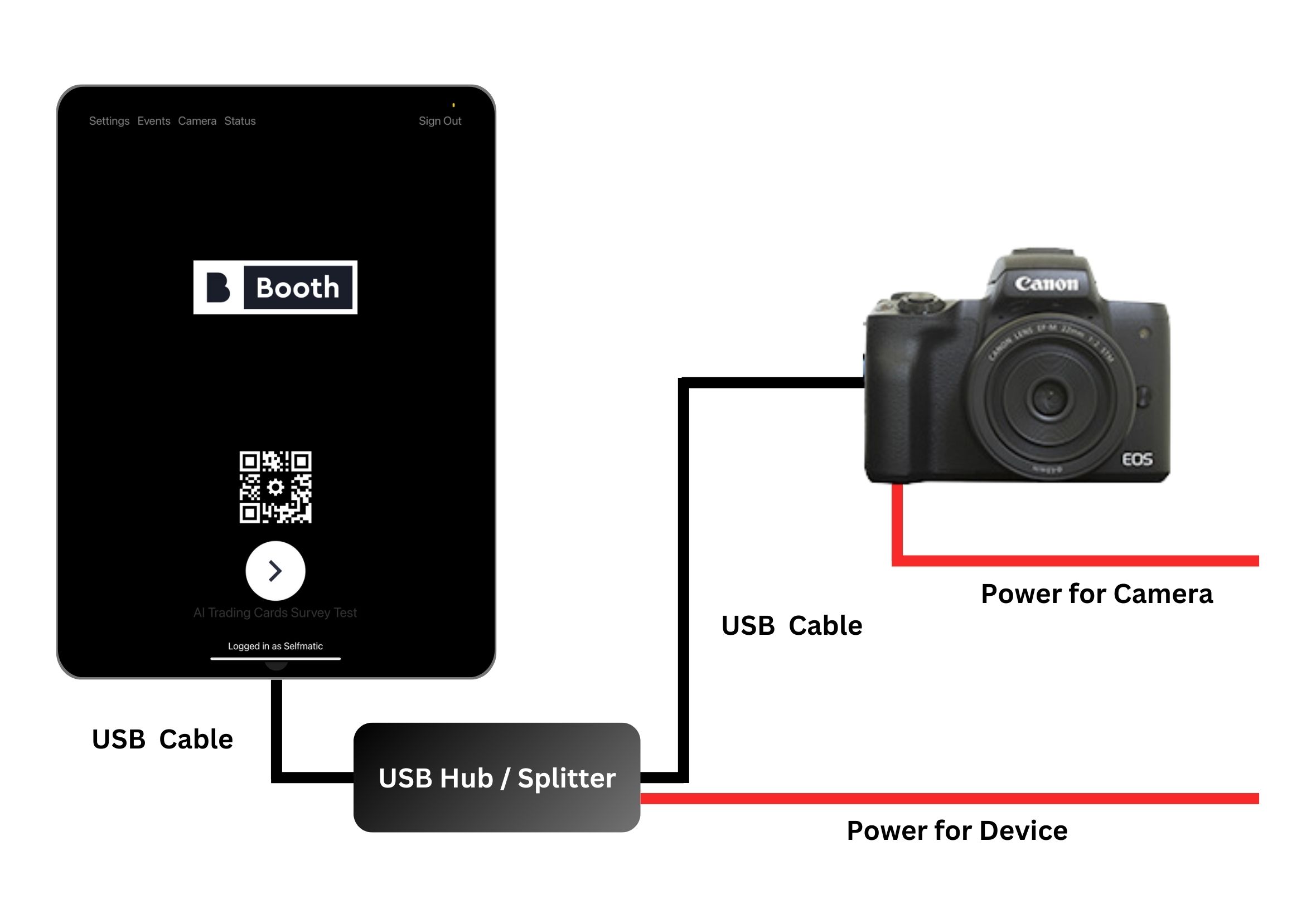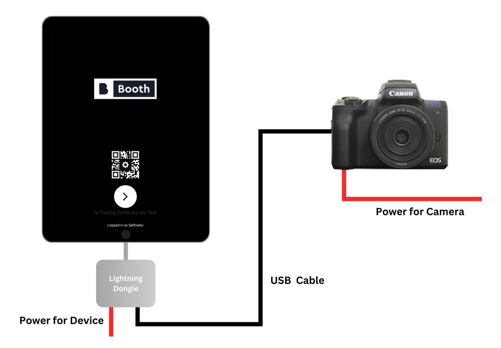 Breeze Booth for iPad can use a Canon camera instead of the iPad’s built-in camera. This gives better image quality when taking photos and allows the use of flash for better lighting. The external camera can be used to take photos and to capture boomerang GIFs and videos.