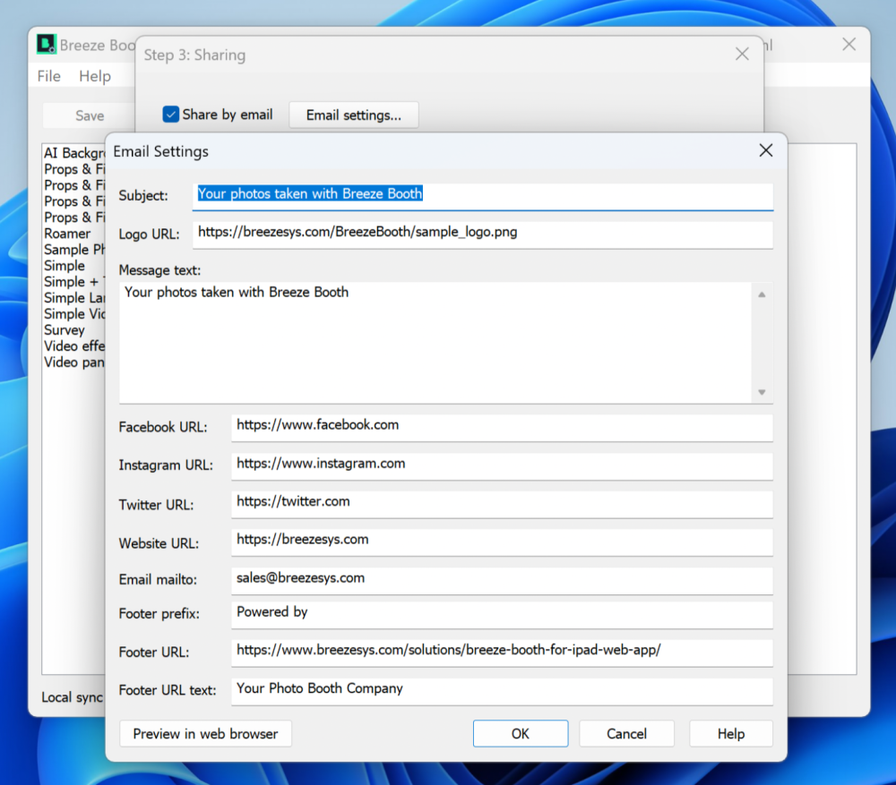 If you have enabled email sharing, select Email Settings… and fill in the required details (subject, message, company info). You can edit this later in the Sharing Settings within your event. Select Preview in Web Browser to see how the email will look when delivered to a user.