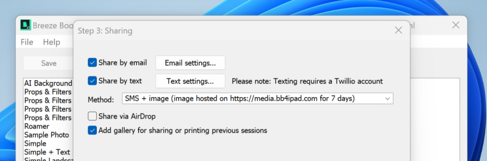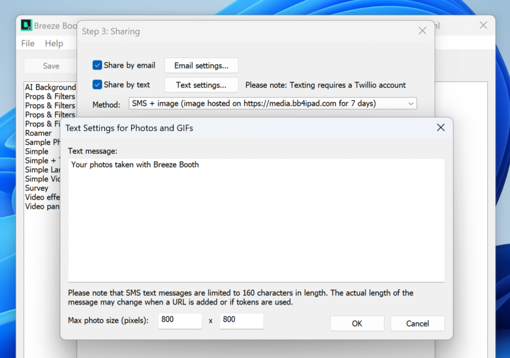 If you have enabled text sharing, select Text Settings… and fill in your text message and the maximum height/width of the media to send. You also need to select the Method (from the drop-down list) of how your text messages will be sent.
