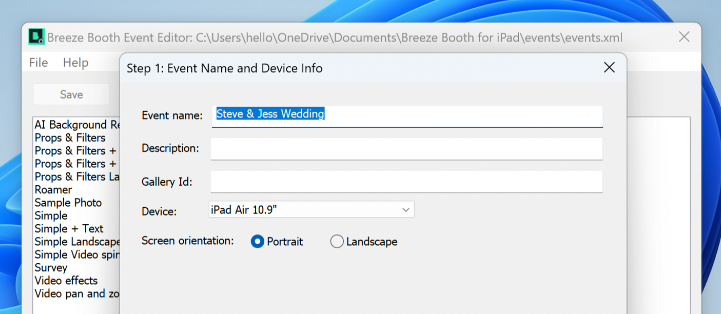 Next enter the details of the event including what type of device you will be using and its screen orientation. It is important to set these correctly, as interfaces in Breeze are designed to match these options specifically.