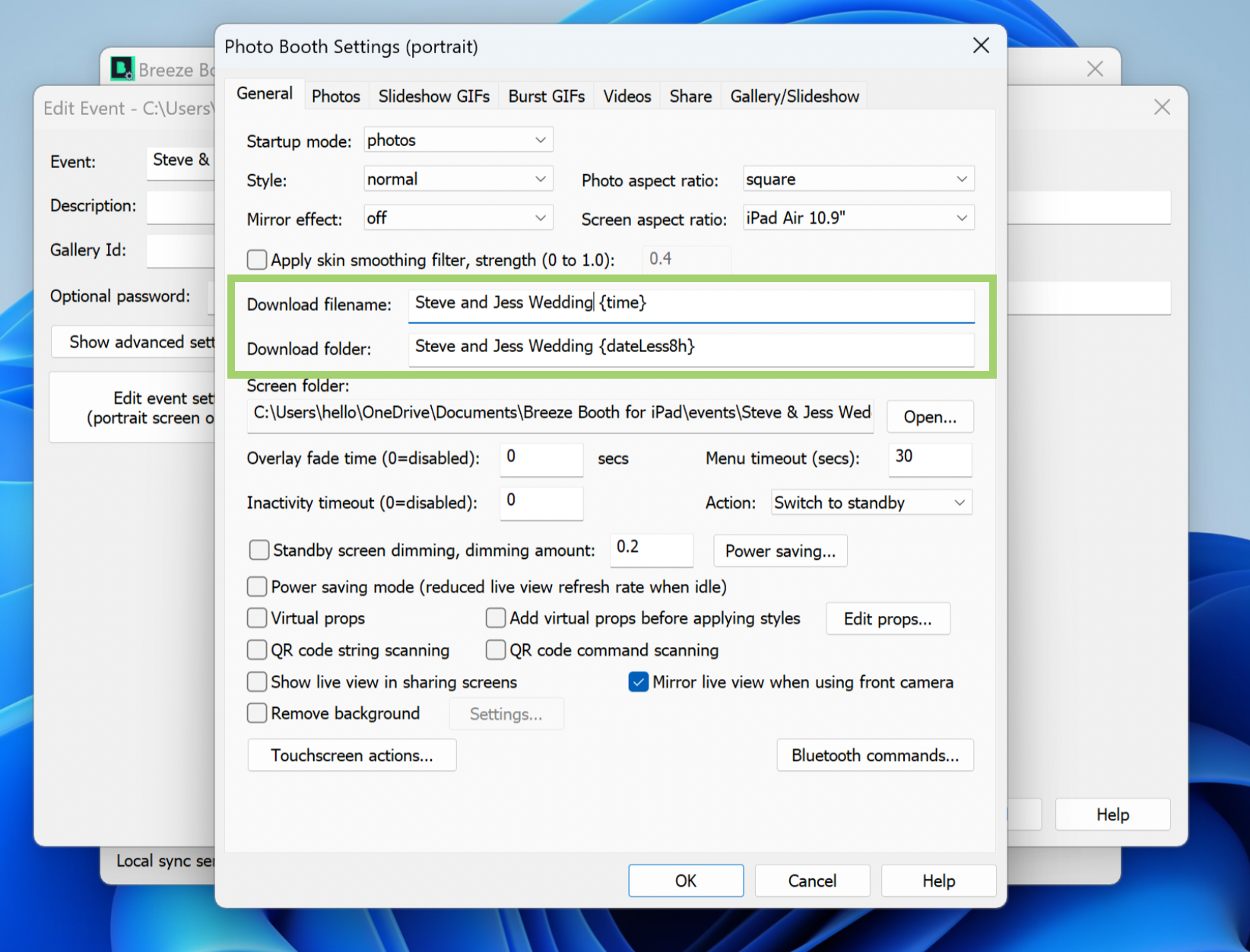 You can edit the Name of the Event, add a Description (this appears alongside the Events in Breeze Booth), Gallery ID (for EventKite) and optional password protection.