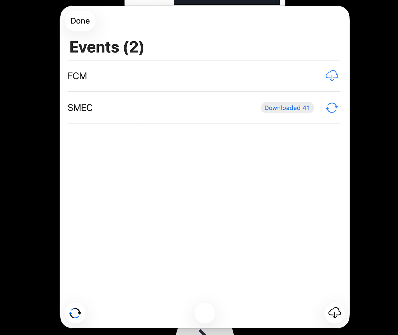 Alternatively tap Sync icon at the bottom left to download a list of events without downloading the files needed for each event. This will quickly download the list of events and you can then choose which individual events you wish to fully load.