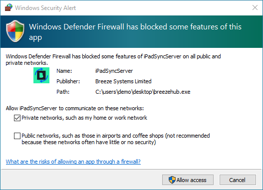 To continue select “Private networks, such as my home or work network” and click “Allow access”. After allowing network access Breeze Hub should work without requiring any other changes to your firewall settings.