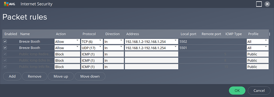 4. In the “Packet rules” window click on the “Add” button to add new rules if required