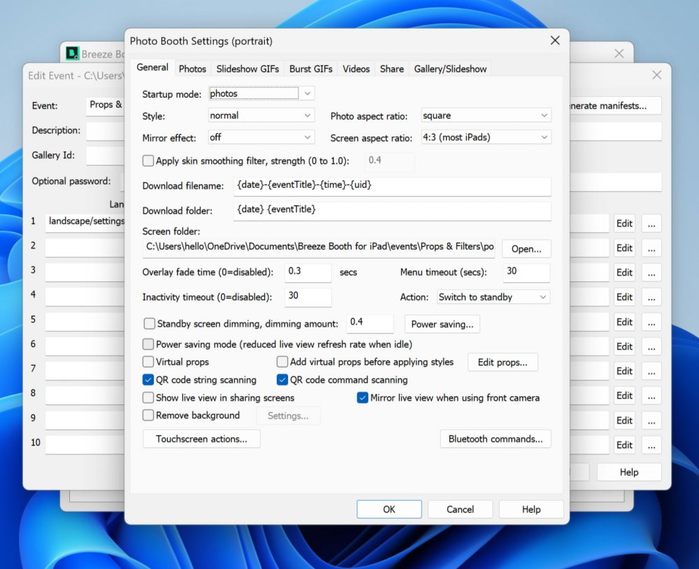The “General” tab in the event editor offers comprehensive settings to configure the startup mode, visual styles, aspect ratios, and effects for photos, GIFs and videos. Users can also adjust mirror effects, apply skin smoothing filters, customize file naming and saving, and manage overlays and transitions. Power-saving options, virtual props, QR code scanning, background removal, touchscreen actions, and Bluetooth commands are also available for enhanced event customization and functionality.