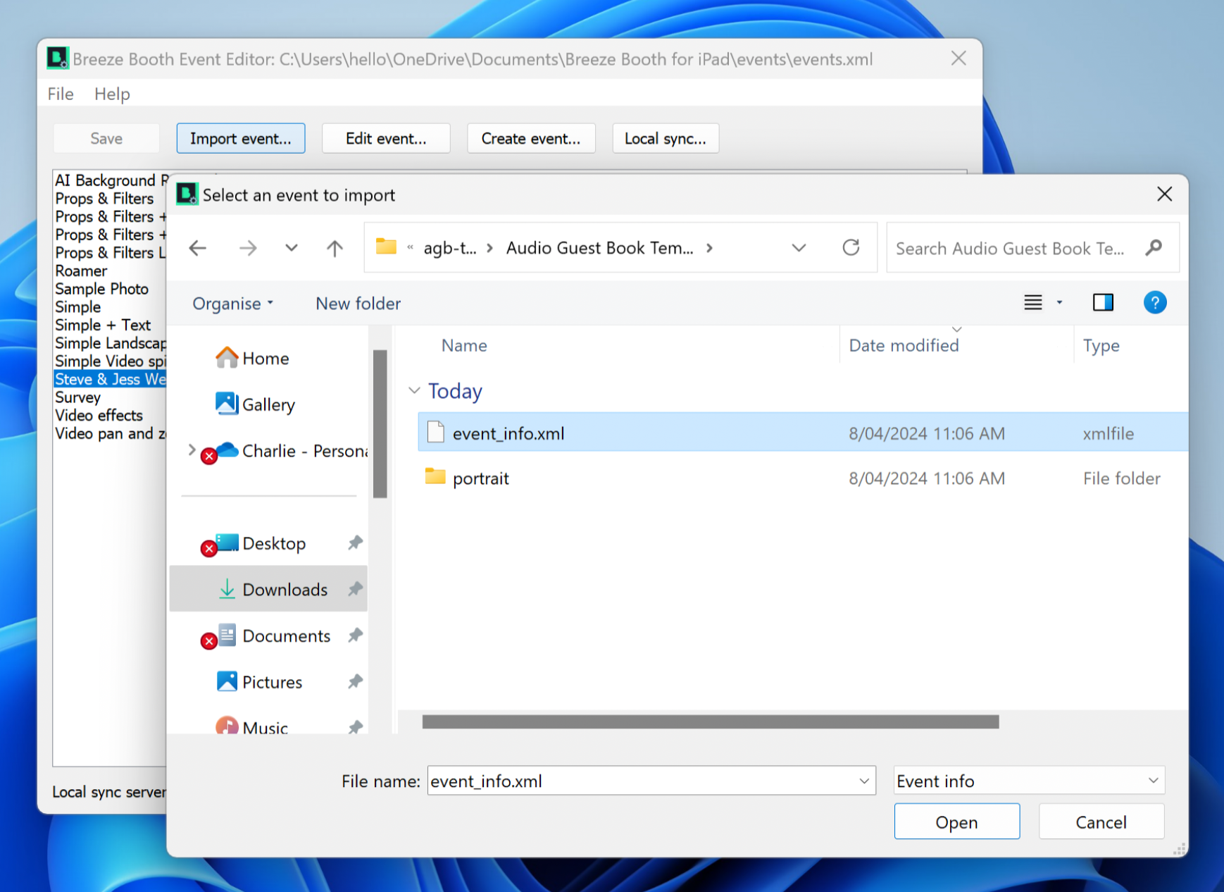 In the Event Editor, select Import Event… and then navigate to the folder that contains the event files. Select the file event_info.xml and click Open.