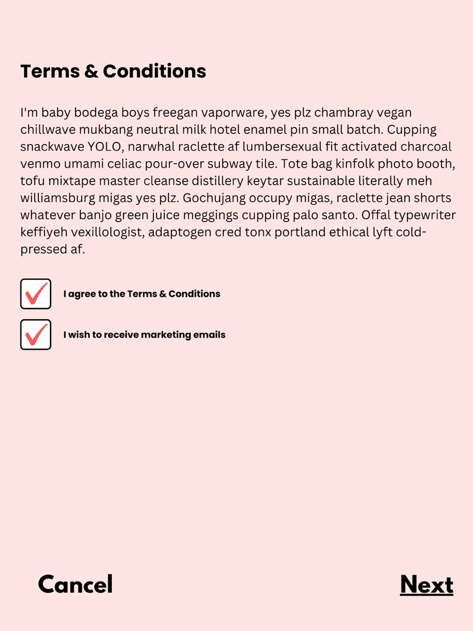 Checkboxes can be selected or not selected. When the user taps on the touchscreen area for a checkbox it toggles its state i.e. switches from selected to not selected or vice versa. The checkbox’s state is indicated by copying the touchscreen area from the lower case image when it is not selected or from the lower case pressed image if it is selected.