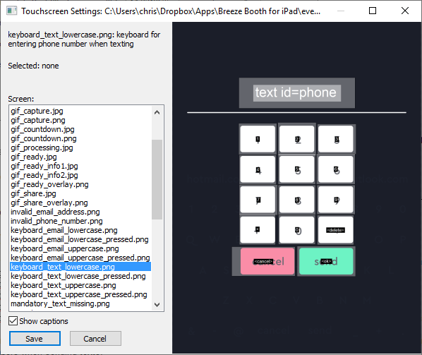 Keyboard behaviour is defined by the key, text area, checkbox and radio button actions defined using the touchscreen editor. As an example, select the keyboard_text_lowercase.png screen image from the list to display the keyboard used for entering phone numbers when sending texts: