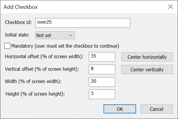 The “Initial state” dropdown list specifies whether the checkbox should be set when the keyboard or survey screen is displayed. The dropdown list has three options: “Set” which checks the checkbox, “Not set” which unchecks the checkbox and “Expression” which allows an expression containing tokens to set the initial state of the checkbox. If the expression evaluates to 0 or an empty string the checkbox will be unchecked otherwise it will be checked.