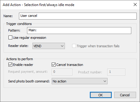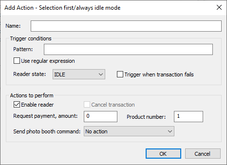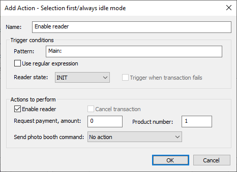 The “Pattern” trigger condition is set to a pattern that matches the kiosk’s state e.g. “Main:” or “Print (payment)”. If “Use regular expression” is not selected the pattern string will match any part of the kiosk status string. We only want to enable the card reader if it is disabled (i.e. the state is INIT) and so we set the reader state in the trigger conditions to INIT.