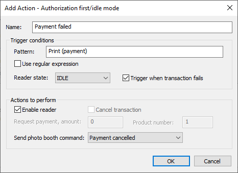 Define a new action named “Payment failed” that is triggered when the photo booth is displaying the print payment screen, the reader state is IDLE and the transaction fails. In the actions to perform section set the photo booth command to “Payment cancelled”.