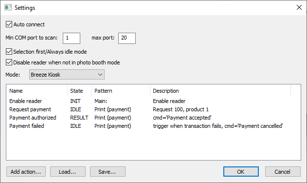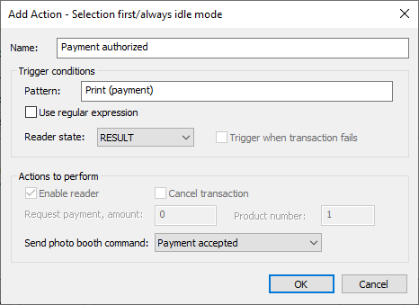 Define a new action named “Payment authorized” that is triggered when the Breeze Kiosk is displaying the print payment screen and the reader state is RESULT. In the actions to perform section set the photo booth command to “Payment accepted”.