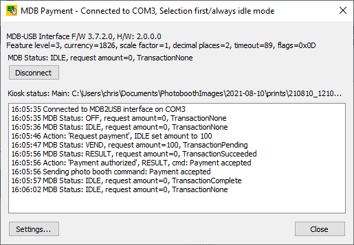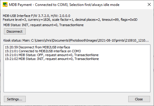 Run the MDB Payment utility on the same PC as Breeze Kiosk. The MDB Payment utility screen should look something like this: