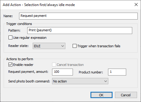 When the user taps print icon in Breeze Kiosk it will switch from the main screen to the to the print payment screen. When this happens we want to request a payment before printing. To do this click on “Add action…” in the settings dialog and name the action “Request payment”. In the trigger conditions section set the pattern to “Print (payment)” and the reader state to IDLE.
