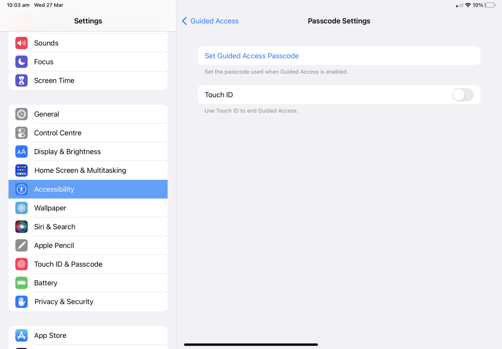 Select Guided Access and then tap Passcode Settings to define a passcode to end Guided Access and to specify whether Touch ID (or Face ID on devices without a physical home button) can be used to end Guided Access.