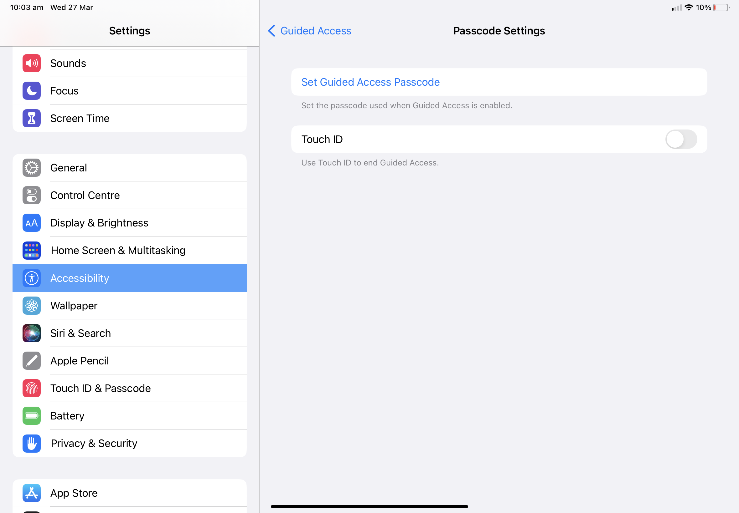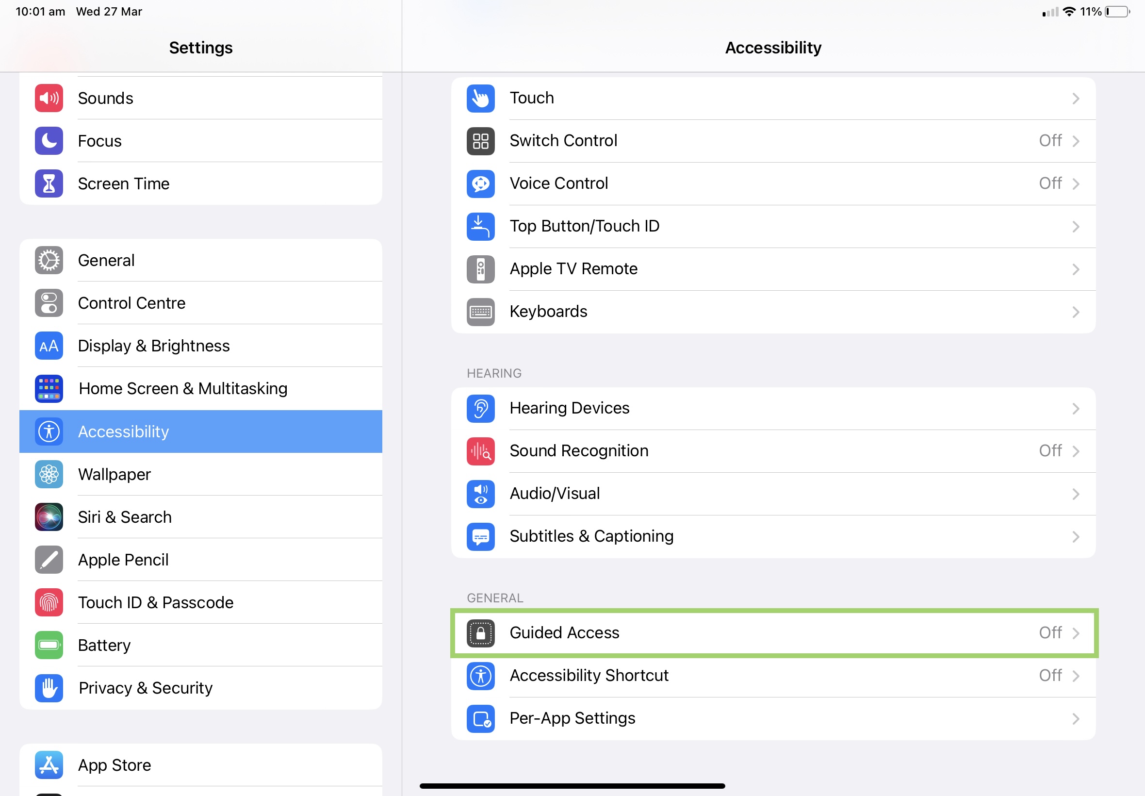 Tap on the iPad settings and select Accessibility, scroll down to the bottom of the screen and tap Guided Access: