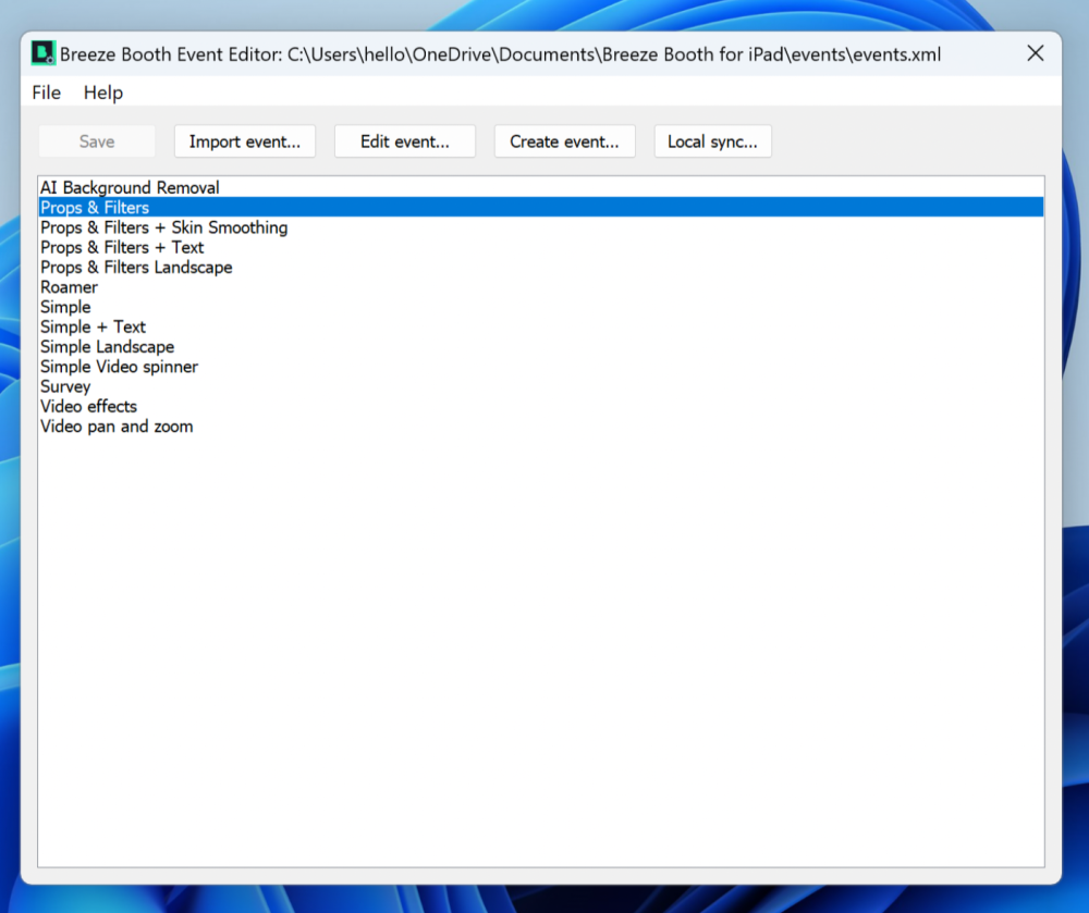 When launched, the Event Editor loads the last set of events or sample events from your Documents folder.