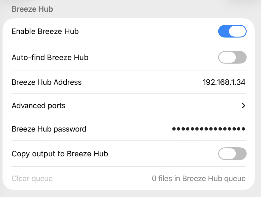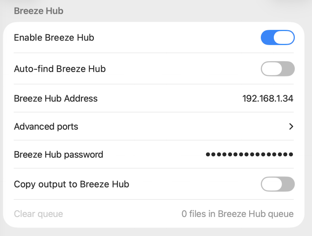 Enable Auto Find Breeze Hub and the app will search your network to find any instances of Hub running. Select the instance of Hub from the menu below.