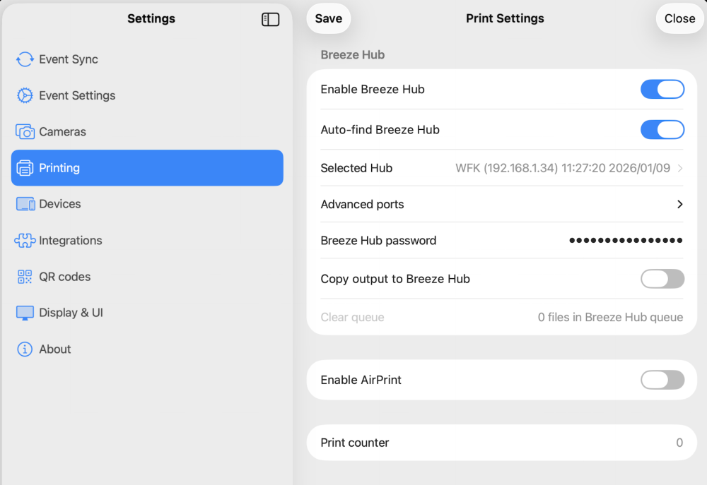 Photos can be printed via Breeze Hub (which can run on a low powered PC and allows printing to any Windows compatible printer) or via AirPrint, which is a simple option, but has limited printer and configuration support.