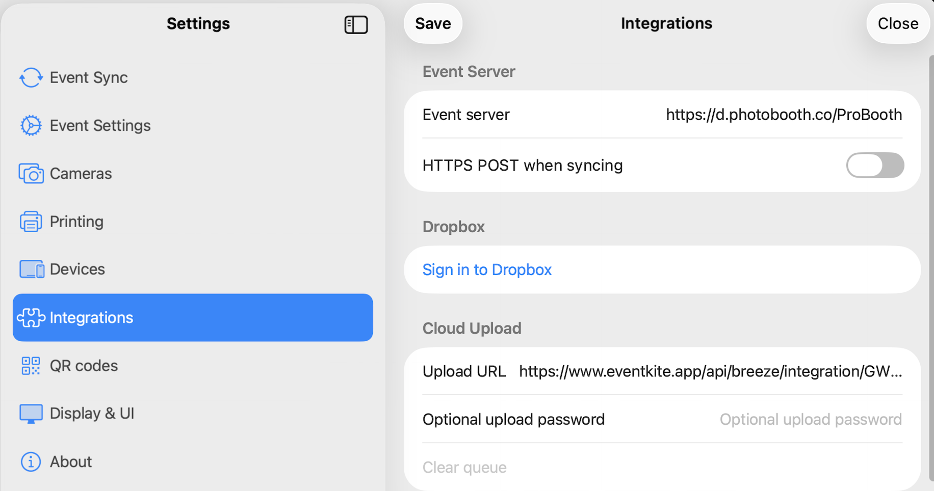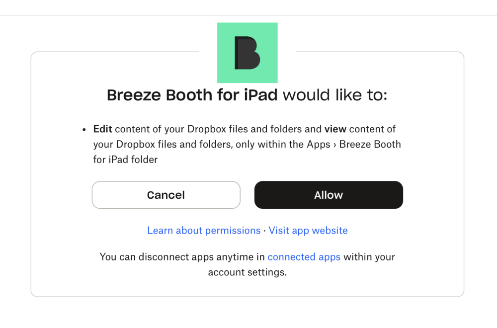 - Open Breeze Booth on your device, go to Settings > Integrations > Sign in to Dropbox