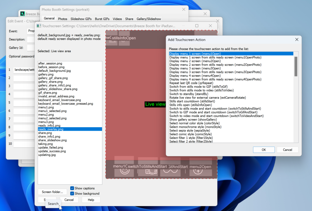 The touchscreen editor provides an interactive way to add touchscreen actions to control the photo booth. It also provides a way to edit touchscreen keyboards and survey screens. Touchscreen actions control what happens when different parts of a screen are touched by the user. Different actions can be defined for specific areas of each screen.