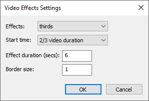 By default each effect consists of a 1 second start transition, 4 secs playback and a 1 second end transition and is applied 2/3 of the way into the final video (or sooner if the video is shorter). Click on the “Settings…” button to adjust the video effect settings: