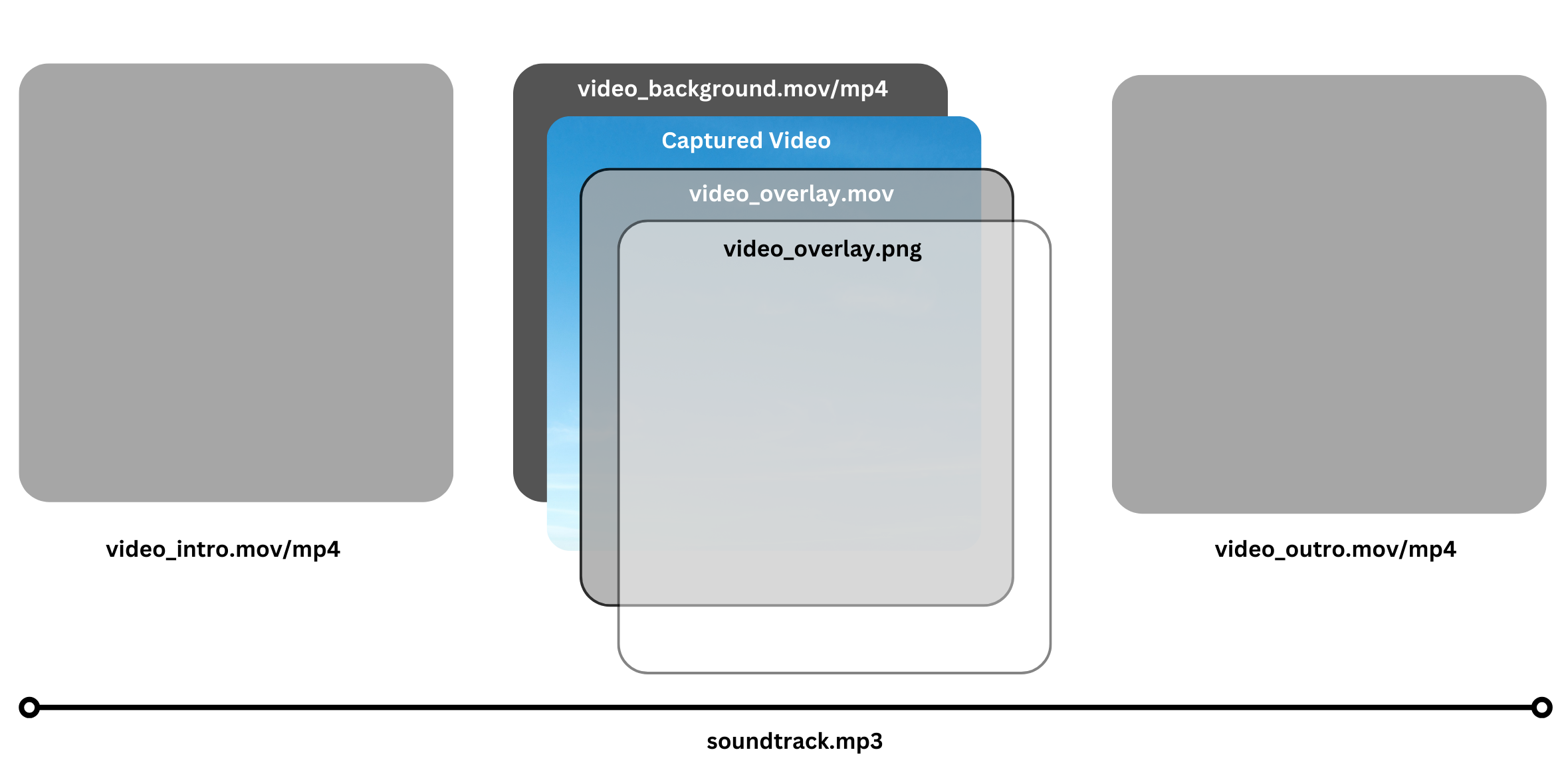 | video_overlay.mov | An optional alpha video placed over the captured video. The alpha channel of the PNG can be used to control the transparency of the different areas of the overlay from fully transparent to fully opaque. Note: Files must be .hevc or ProRes4444 |