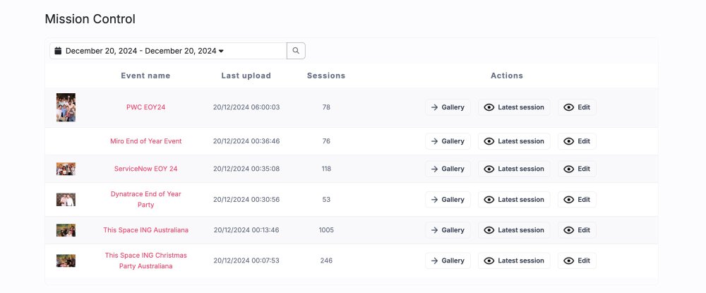 For each event, a thumbnail of the most recent media file is displayed alongside the event name, the date of the last session, and the total number of sessions. Additionally, you can view a specific event’s Gallery, its Last Session, or choose to Edit the event.