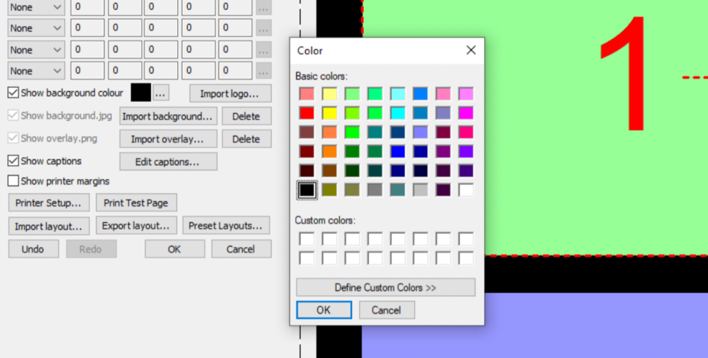 Normally, the page background is white, but it can be set to any color by clicking on the “…” button next to the colored square beside the Show background color checkbox.
