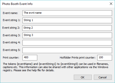 The information is saved in the Windows registry so that it may be shared with other applications and is read from the Windows registry before it is used so that it can use information supplied by other applications. The Photo Booth Event Info dialog can be displayed by selecting Event info from the File menu.