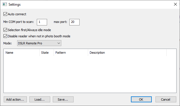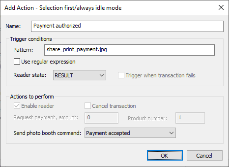 Define a new action named “Payment authorized” that is triggered when the photo booth is displaying the print payment screen and the reader state is RESULT. In the actions to perform section set the photo booth command to “Payment accepted”.