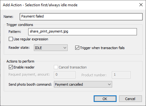 Define a new action named “Payment failed” that is triggered when the photo booth is displaying the print payment screen, the reader state is IDLE and the transaction fails. In the actions to perform section set the photo booth command to “Print “.