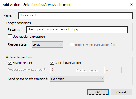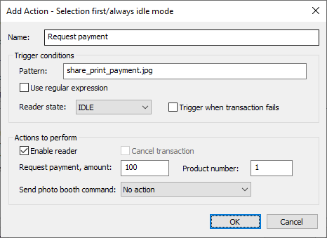 When the users taps on the print touchscreen action in the sharing screen the print payment screen is displayed and we need to request payment from the card reader. To do this click on “Add action…” in the settings dialog and name the action “Request payment”. In the trigger conditions section set the pattern to share_print_payment and the reader state to IDLE.