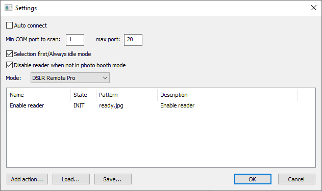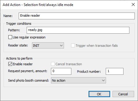 Give the action a suitable name e.g. “Enable reader” and then set the trigger conditions in the section below. What we want to do is enable the card reader when the photo booth is displaying the ready.jpg screen if the card reader is disabled.