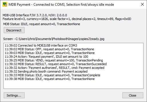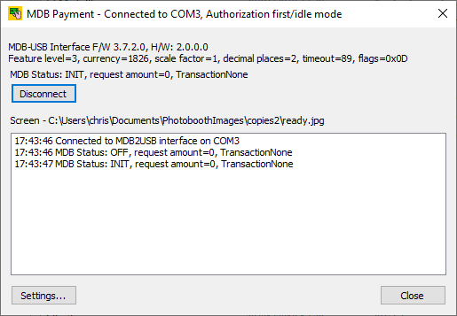 Run Breeze RemotePro in photo booth mode and run the MDB Payment utility. The MDB Payment utility screen should look something like this: