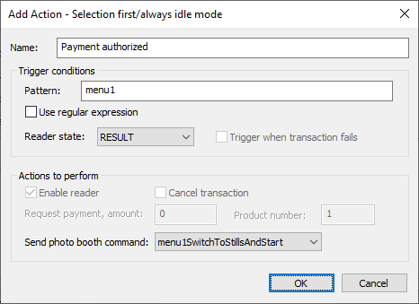 Define a new action named “Payment authorized” that is triggered when the photo booth is displaying the menu 1 screen and the reader state is RESULT. In the actions to perform section set the photo booth command to “menu1SwitchToStillsAndStart”.