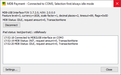 Run the MDB Payment utility on the same PC as the Camera Controller utility. The MDB Payment utility screen should look something like this: