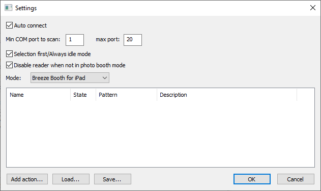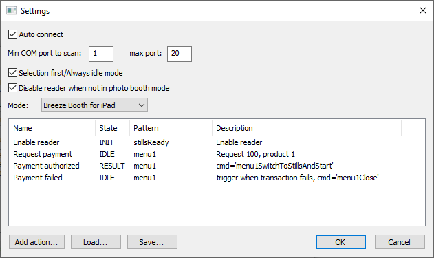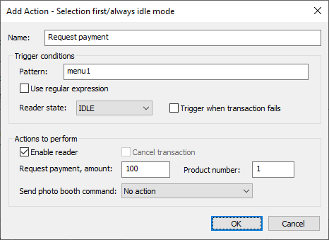When the user taps the photo booth screen it will switch from the stillsReady screen to the to menu 1 screen. When this happens we want to request payment before starting the countdown. To do this click on “Add action…” in the settings dialog and name the action “Request payment”. In the trigger conditions section set the pattern to menu1 and the reader state to IDLE.